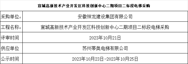 宣城高新技術產業開發區科技創新中心二期項目二標段電梯采購結果公示