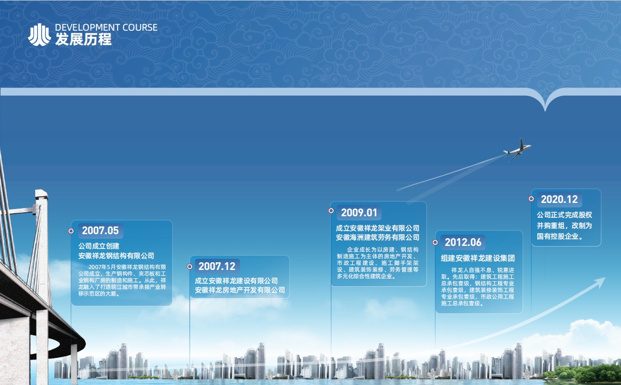 安徽祥龍建設(shè)集團(tuán)有限公司成立于2005年,企業(yè)注冊資本金1.46億元,現(xiàn)擁有建筑工程施工總承包、市政公用工程施工總承包、建筑裝修裝飾工程專業(yè)承包、鋼結(jié)構(gòu)工程專業(yè)承包(全資子公司安徽祥龍鋼結(jié)構(gòu)有限公司)等四項(xiàng)國家壹級資質(zhì)。2020年12月公司正式完成股權(quán)并購重組,改制為國有控股企業(yè)。